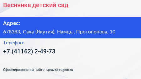 Веснянка, детский сад по адресу 678383, Саха (Якутия), Намцы, Протопопова, 10 в дальнейшем Организация, размещена в следующих категориях: