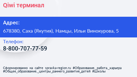 Qiwi, терминал по адресу 678380, Саха (Якутия), Намцы, Ильи Винокурова, 5 в дальнейшем Организация, размещена в следующих категориях: