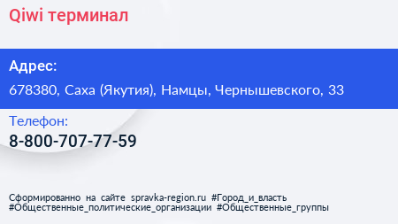 Qiwi, терминал по адресу 678380, Саха (Якутия), Намцы, Чернышевского, 33 в дальнейшем Организация, размещена в следующих категориях: