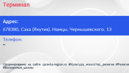 Терминал по адресу 678380, Саха (Якутия), Намцы, Чернышевского, 13 в дальнейшем Организация, размещена в следующих категориях: