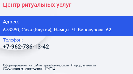 Центр ритуальных услуг по адресу 678380, Саха (Якутия), Намцы, Ч. Винокурова, 62 в дальнейшем Организация, размещена в следующих категориях: