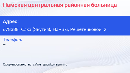 Намская центральная районная больница по адресу 678388, Саха (Якутия), Намцы, Решетниковой, 2 в дальнейшем Организация, размещена в следующих категориях: