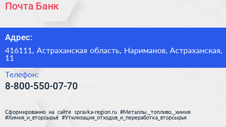 Почта Банк по адресу 416111, Астраханская область, Нариманов, Астраханская, 11 в дальнейшем Организация, размещена в следующих категориях: