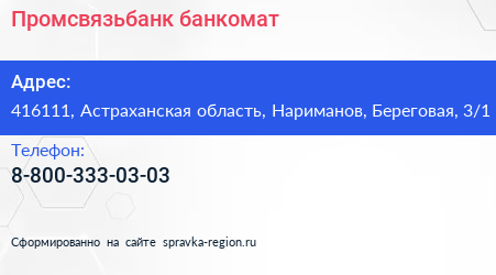 Промсвязьбанк, банкомат по адресу 416111, Астраханская область, Нариманов, Береговая, 3/1 в дальнейшем Организация, размещена в следующих категориях: