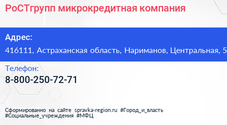 РоСТгрупп, микрокредитная компания по адресу 416111, Астраханская область, Нариманов, Центральная, 5 в дальнейшем Организация, размещена в следующих категориях: