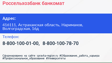 Россельхозбанк, банкомат по адресу 416111, Астраханская область, Нариманов, Волгоградская, 16д в дальнейшем Организация, размещена в следующих категориях: