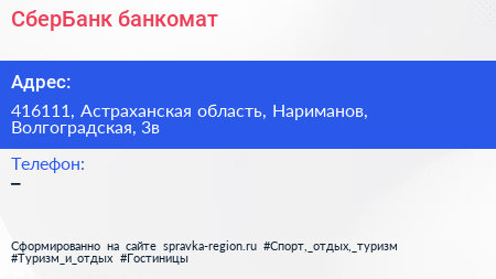 СберБанк, банкомат по адресу 416111, Астраханская область, Нариманов, Волгоградская, 3в в дальнейшем Организация, размещена в следующих категориях: