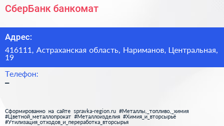 СберБанк, банкомат по адресу 416111, Астраханская область, Нариманов, Центральная, 19 в дальнейшем Организация, размещена в следующих категориях: