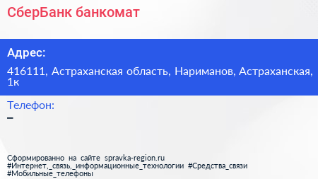 СберБанк, банкомат по адресу 416111, Астраханская область, Нариманов, Астраханская, 1к в дальнейшем Организация, размещена в следующих категориях: