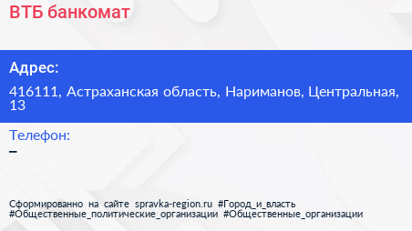 ВТБ, банкомат по адресу 416111, Астраханская область, Нариманов, Центральная, 13 в дальнейшем Организация, размещена в следующих категориях: