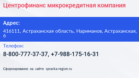 Центрофинанс, микрокредитная компания по адресу 416111, Астраханская область, Нариманов, Астраханская, 6 в дальнейшем Организация, размещена в следующих категориях: