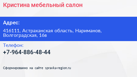 Кристина, мебельный салон по адресу 416111, Астраханская область, Нариманов, Волгоградская, 16в в дальнейшем Организация, размещена в следующих категориях: