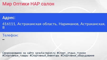 Мир Оптики НАР, салон по адресу 416111, Астраханская область, Нариманов, Астраханская, 8 в дальнейшем Организация, размещена в следующих категориях: