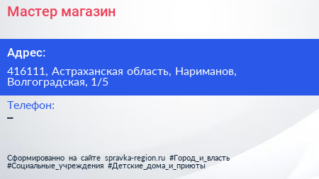Мастер, магазин по адресу 416111, Астраханская область, Нариманов, Волгоградская, 1/5 в дальнейшем Организация, размещена в следующих категориях: