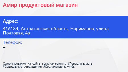 Амир, продуктовый магазин по адресу 416134, Астраханская область, Нариманов, улица Почтовая, 4в в дальнейшем Организация, размещена в следующих категориях: