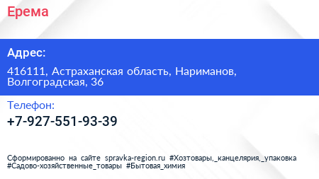 Ерема по адресу 416111, Астраханская область, Нариманов, Волгоградская, 36 в дальнейшем Организация, размещена в следующих категориях: