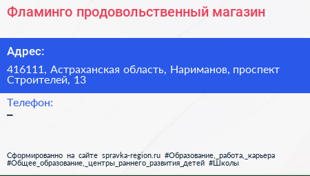 Фламинго, продовольственный магазин по адресу 416111, Астраханская область, Нариманов, проспект Строителей, 13 в дальнейшем Организация, размещена в следующих категориях: