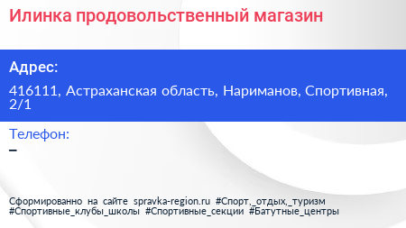 Илинка, продовольственный магазин по адресу 416111, Астраханская область, Нариманов, Спортивная, 2/1 в дальнейшем Организация, размещена в следующих категориях: