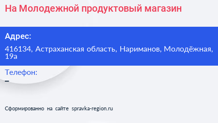 На Молодежной, продуктовый магазин по адресу 416134, Астраханская область, Нариманов, Молодёжная, 19а в дальнейшем Организация, размещена в следующих категориях: