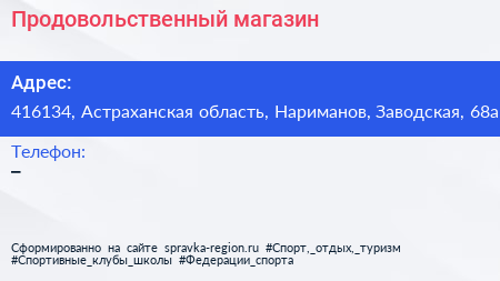 Продовольственный магазин по адресу 416134, Астраханская область, Нариманов, Заводская, 68а в дальнейшем Организация, размещена в следующих категориях: