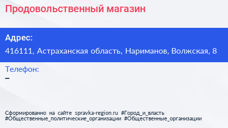 Продовольственный магазин по адресу 416111, Астраханская область, Нариманов, Волжская, 8 в дальнейшем Организация, размещена в следующих категориях: