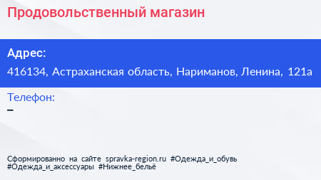 Продовольственный магазин по адресу 416134, Астраханская область, Нариманов, Ленина, 121а в дальнейшем Организация, размещена в следующих категориях: