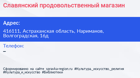Славянский, продовольственный магазин по адресу 416111, Астраханская область, Нариманов, Волгоградская, 16д в дальнейшем Организация, размещена в следующих категориях: