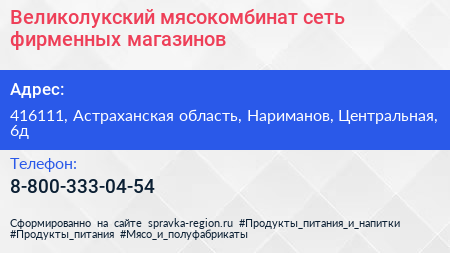 Великолукский мясокомбинат, сеть фирменных магазинов по адресу 416111, Астраханская область, Нариманов, Центральная, 6д в дальнейшем Организация, размещена в следующих категориях: