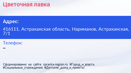Цветочная лавка по адресу 416111, Астраханская область, Нариманов, Астраханская, 7/1 в дальнейшем Организация, размещена в следующих категориях: