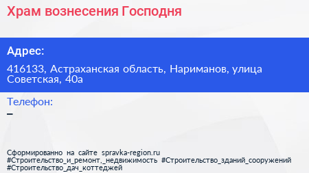 Храм вознесения Господня по адресу 416133, Астраханская область, Нариманов, улица Советская, 40а в дальнейшем Организация, размещена в следующих категориях: