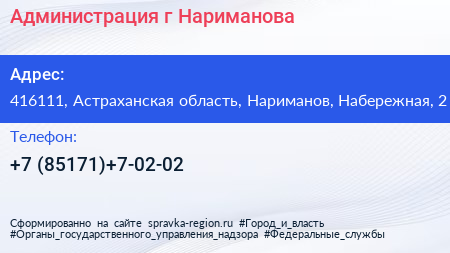 Администрация г. Нариманова по адресу 416111, Астраханская область, Нариманов, Набережная, 2 в дальнейшем Организация, размещена в следующих категориях:
