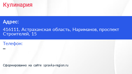 Кулинария по адресу 416111, Астраханская область, Нариманов, проспект Строителей, 15 в дальнейшем Организация, размещена в следующих категориях: