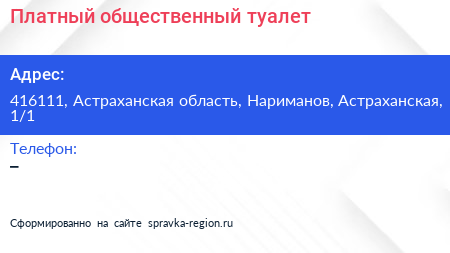 Платный общественный туалет по адресу 416111, Астраханская область, Нариманов, Астраханская, 1/1 в дальнейшем Организация, размещена в следующих категориях: