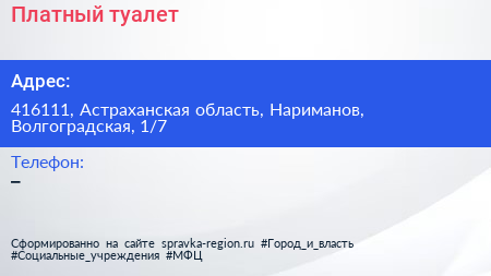 Платный туалет по адресу 416111, Астраханская область, Нариманов, Волгоградская, 1/7 в дальнейшем Организация, размещена в следующих категориях: