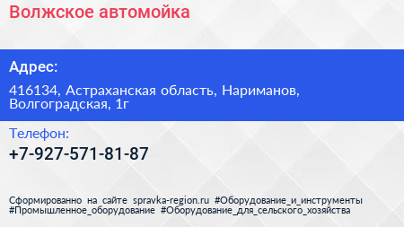 Волжское, автомойка по адресу 416134, Астраханская область, Нариманов, Волгоградская, 1г в дальнейшем Организация, размещена в следующих категориях: