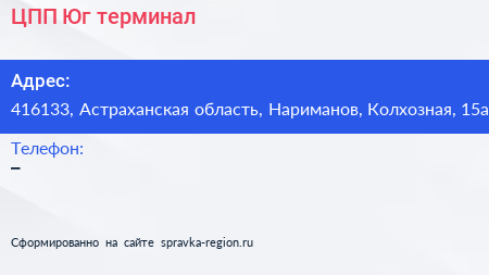 ЦПП-Юг, терминал по адресу 416133, Астраханская область, Нариманов, Колхозная, 15а в дальнейшем Организация, размещена в следующих категориях: