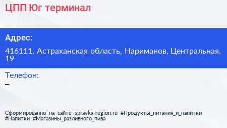 ЦПП-Юг, терминал по адресу 416111, Астраханская область, Нариманов, Центральная, 19 в дальнейшем Организация, размещена в следующих категориях:
