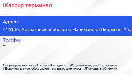 iКассир, терминал по адресу 416136, Астраханская область, Нариманов, Школьная, 14а в дальнейшем Организация, размещена в следующих категориях: