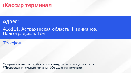iКассир, терминал по адресу 416111, Астраханская область, Нариманов, Волгоградская, 16д в дальнейшем Организация, размещена в следующих категориях: