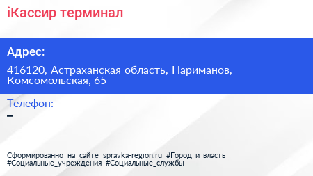 iКассир, терминал по адресу 416120, Астраханская область, Нариманов, Комсомольская, 65 в дальнейшем Организация, размещена в следующих категориях: