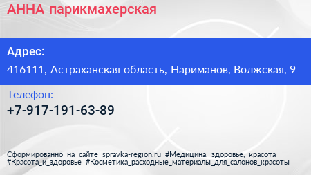 АННА, парикмахерская по адресу 416111, Астраханская область, Нариманов, Волжская, 9 в дальнейшем Организация, размещена в следующих категориях: