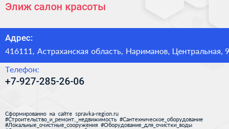 Элиж, салон красоты по адресу 416111, Астраханская область, Нариманов, Центральная, 9 в дальнейшем Организация, размещена в следующих категориях: