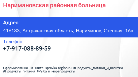 Наримановская районная больница по адресу 416133, Астраханская область, Нариманов, Степная, 16в в дальнейшем Организация, размещена в следующих категориях: