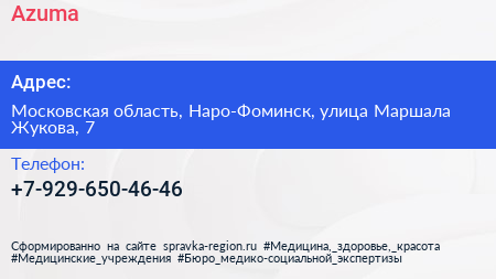 Azuma по адресу Московская область, Наро-Фоминск, улица Маршала Жукова, 7 в дальнейшем Организация, размещена в следующих категориях: