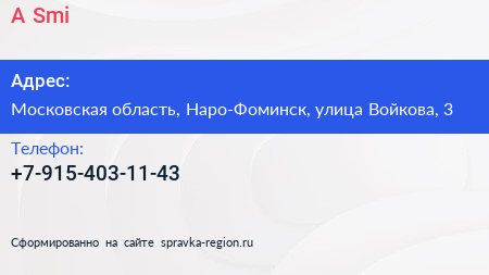 A.Smi по адресу Московская область, Наро-Фоминск, улица Войкова, 3 в дальнейшем Организация, размещена в следующих категориях: