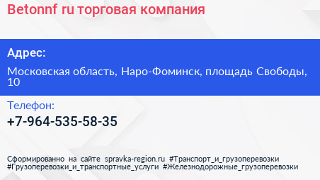 Betonnf.ru, торговая компания по адресу Московская область, Наро-Фоминск, площадь Свободы, 10 в дальнейшем Организация, размещена в следующих категориях: