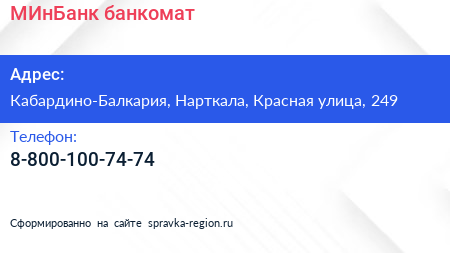 МИнБанк, банкомат по адресу Кабардино-Балкария, Нарткала, Красная улица, 249 в дальнейшем Организация, размещена в следующих категориях: