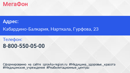 МегаФон по адресу Кабардино-Балкария, Нарткала, Гурфова, 23 в дальнейшем Организация, размещена в следующих категориях: