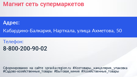 Магнит, сеть супермаркетов по адресу Кабардино-Балкария, Нарткала, улица Ахметова, 50 в дальнейшем Организация, размещена в следующих категориях: