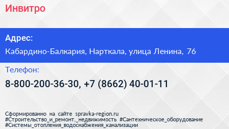 Инвитро по адресу Кабардино-Балкария, Нарткала, улица Ленина, 76 в дальнейшем Организация, размещена в следующих категориях: